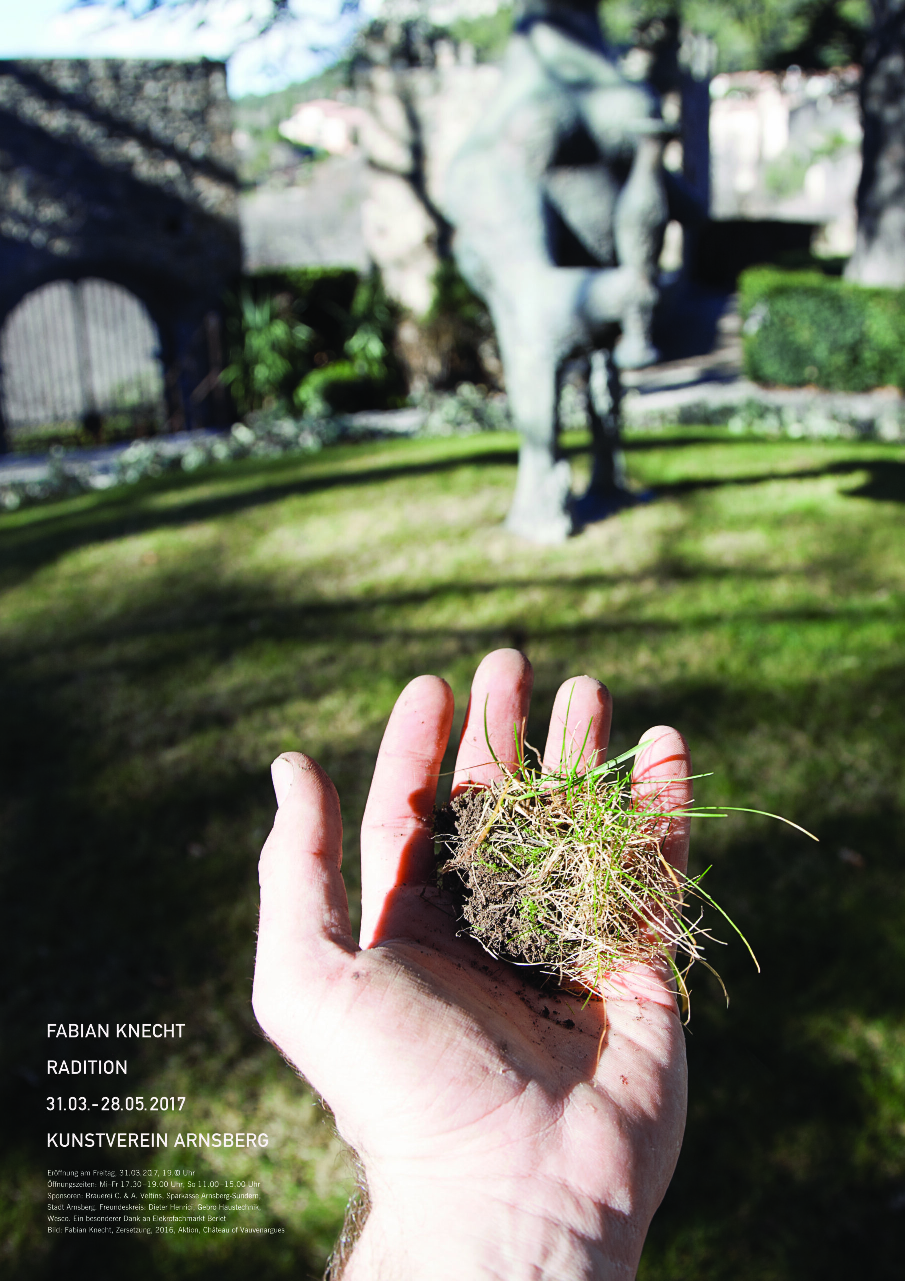 Der Titel der Ausstellung »RADITION« variiert das fachsprachliche Verb »radizieren« – von lat. radix, Wurzel –, das in der Mathematik das Ziehen einer Wurzel bezeichnet. Metaphorisch verwendet, bezeichnet der Neologismus die Auseinandersetzung mit den Themen ›Entwurzelung‹ und Neuverortung, die in unterschiedlichen Formen und Facetten die Ausstellung strukturieren. Im Zentrum stehen Variationen des mittlerweile klassischen Konzepts des Readymades, das von Knecht invertiert, gedeutet und ebenso vielfältig wie ungewohnt in Stellung gebracht wird.
