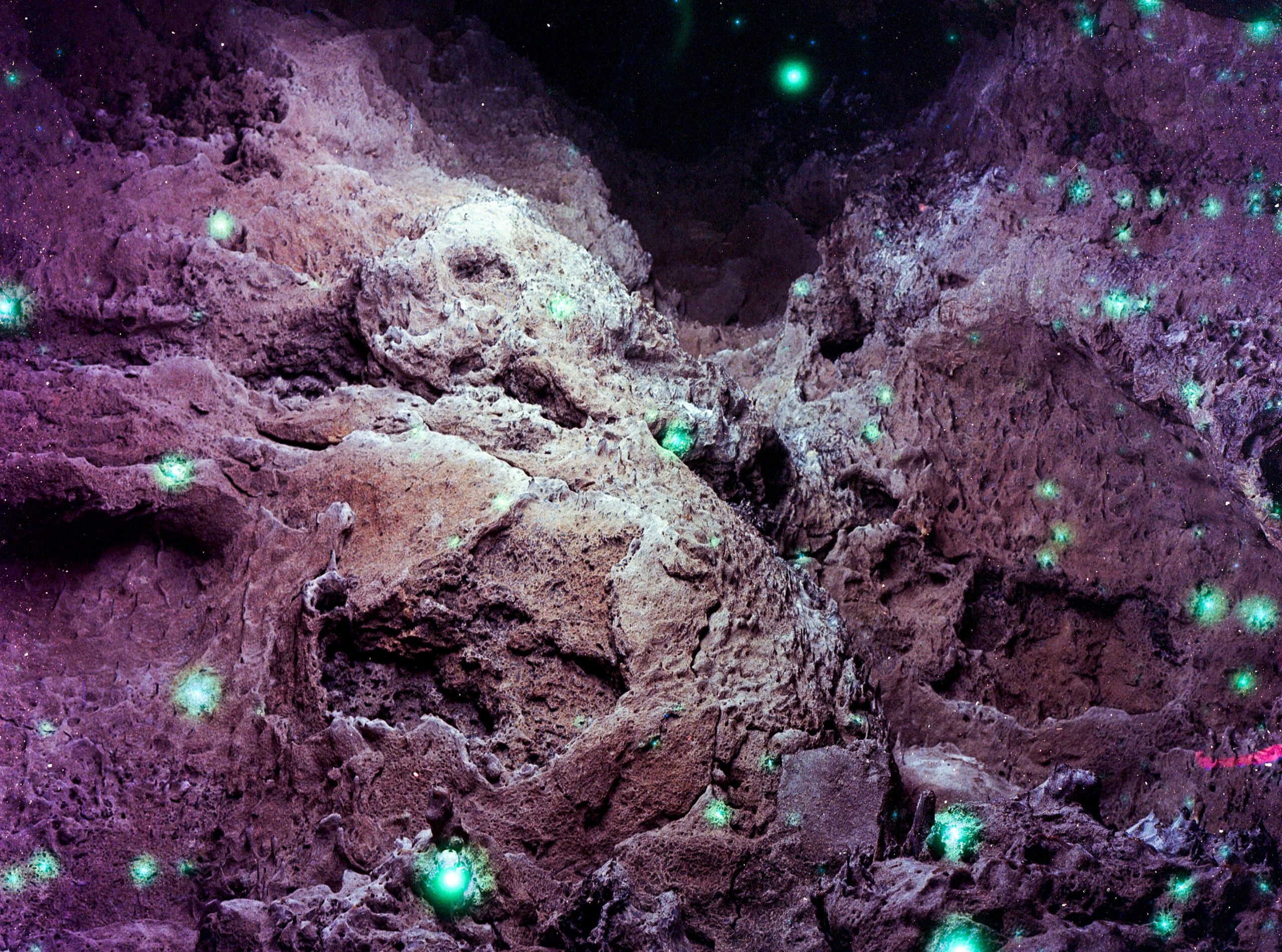 Der Parcours beginnt mit den floralen Malereien von assume vivid astro focus (AVAF), die zarte Strukturen zwischen organischer Natur und kosmischer Imagination entfalten. Dazwischen entfalten die Vulkanfotografien von Louis Braddock Clarke ihre kraftvolle Präsenz, eruptiv, monumental und zugleich sensibel für die Texturen von Erde, Licht und Form. Adriano Amarals „Prosthetic Painting Series“ (2023) entführt die Besucher:innen in Sci-Fi-Sumpflandschaften, die die materielle Vorstellungskraft der Versumpfungsmetapher verbildlichen – Orte des Übergangs, der Transformation und des stetigen Werdens.